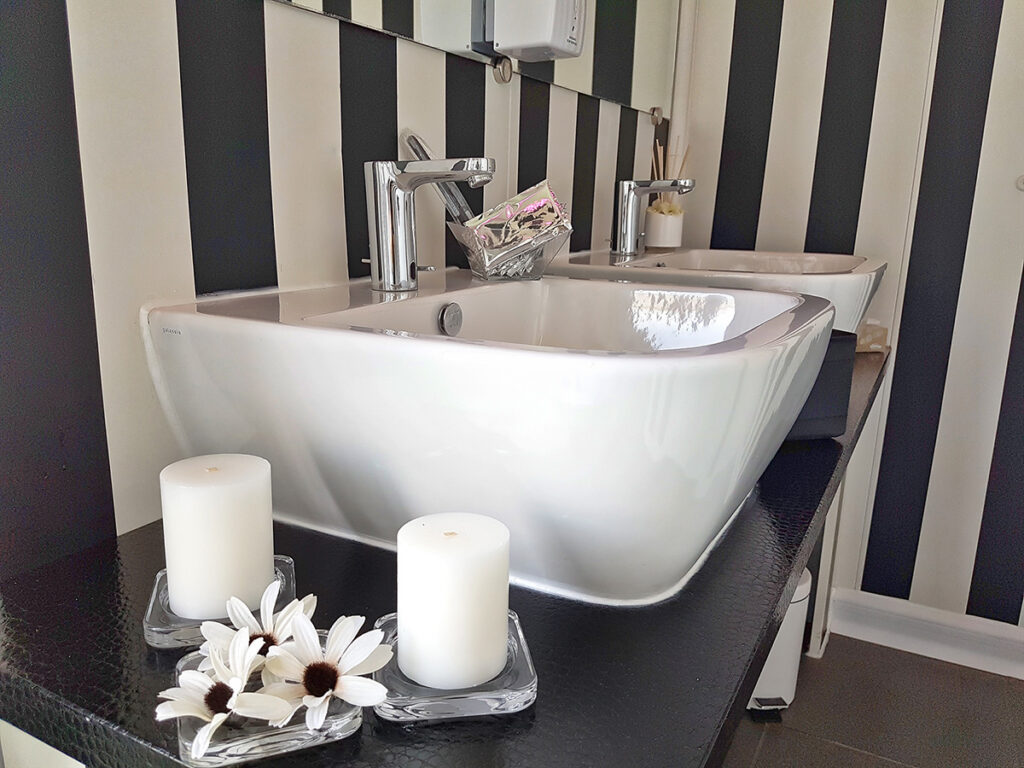 Antibagno con doppio lavabo, ampio specchio, illuminazione alogena a luce calda, asciugamani elettrico no touch e dosatore sapone automatico, rubinetti elettronici no touch.